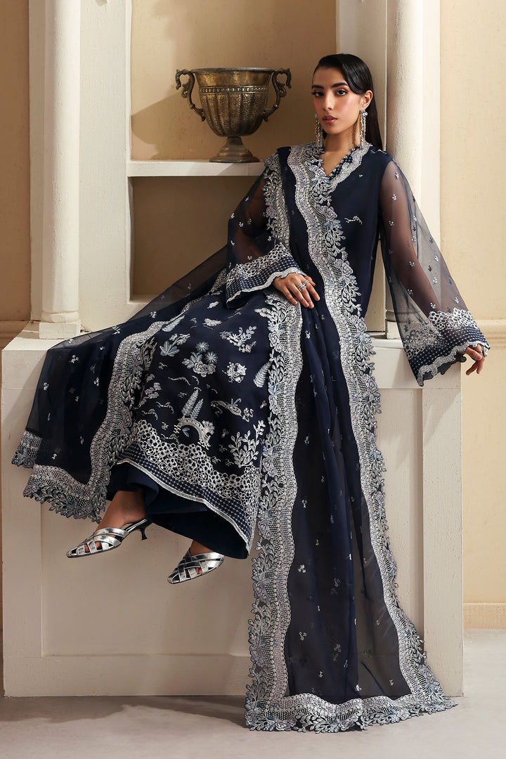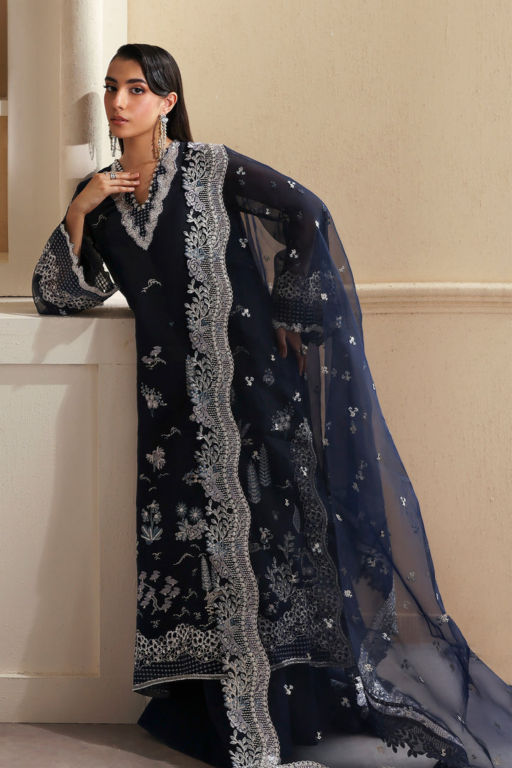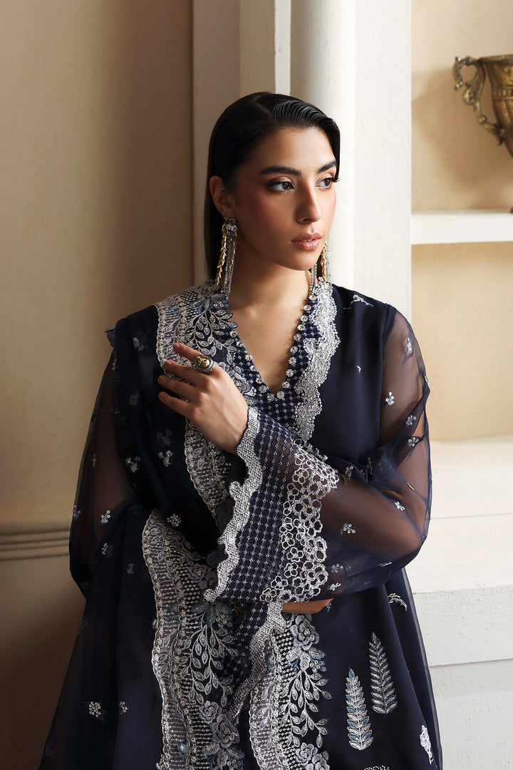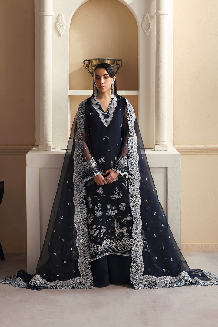 Blue that speaks in whispers of depth. The organza shirt holds a refined poise, paired with a dupatta that shimmers softly. Raw silk trousers ground the ensemble in timeless elegance.