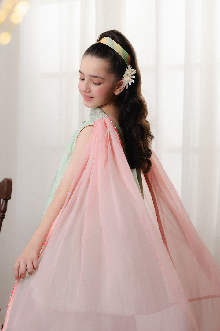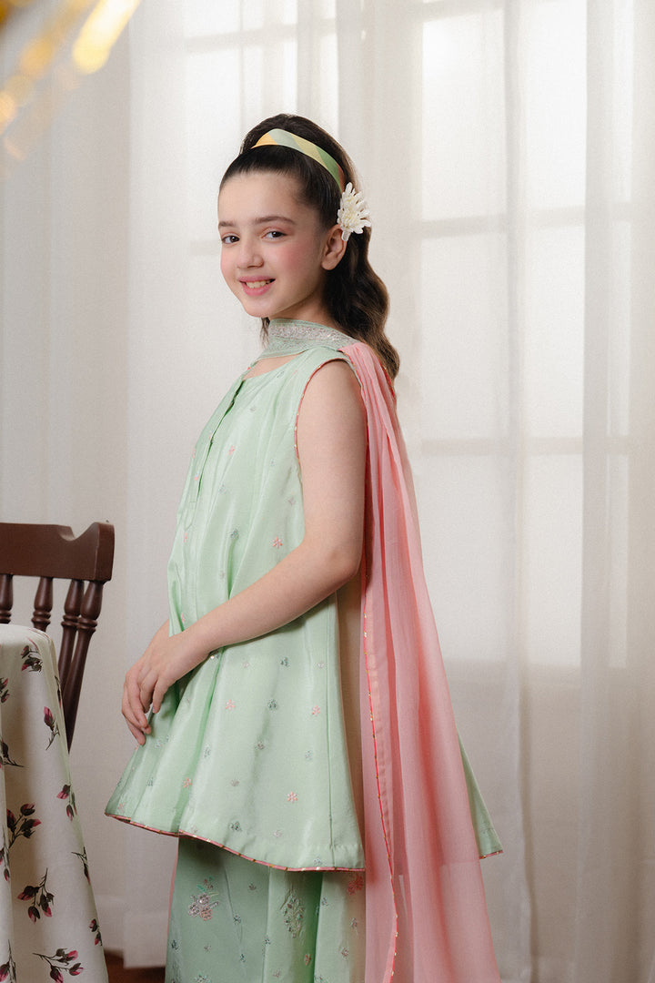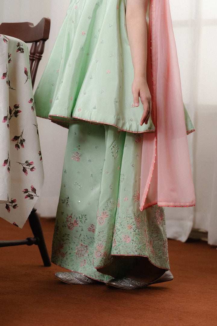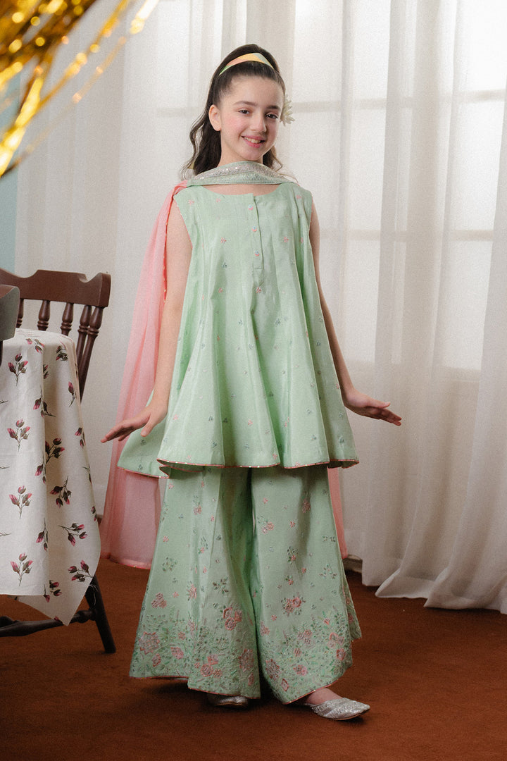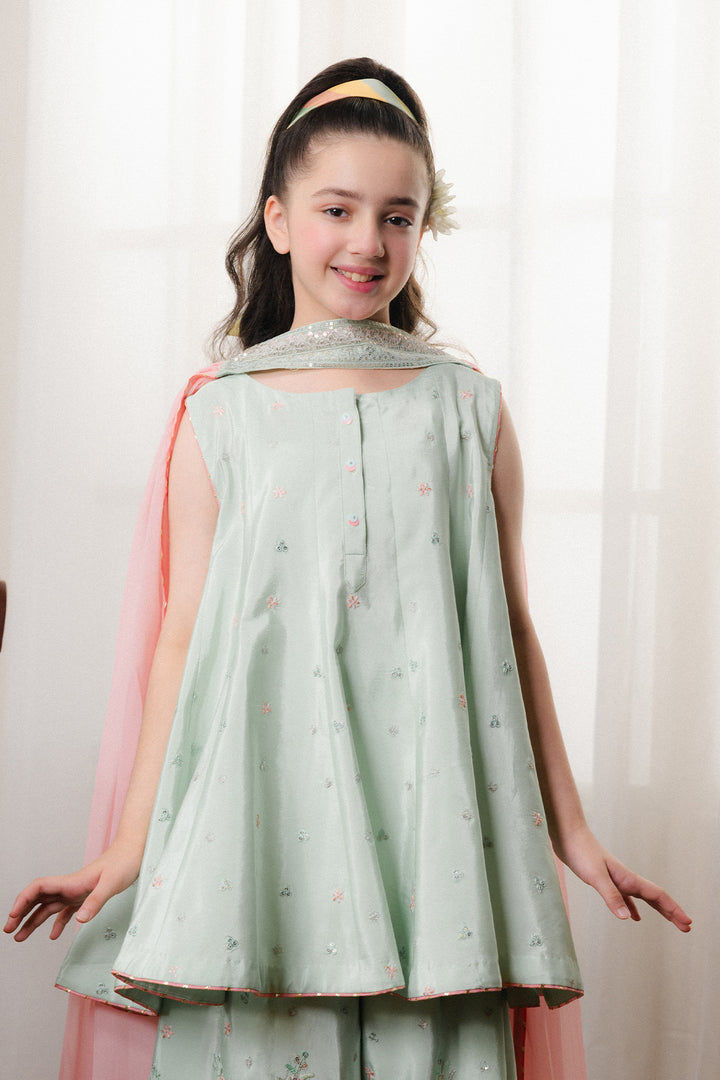 Three-piece silk set with sequined embroidered shirt, minimal neckline details and embroidered culottes, paired with an embroidered band dupatta.
