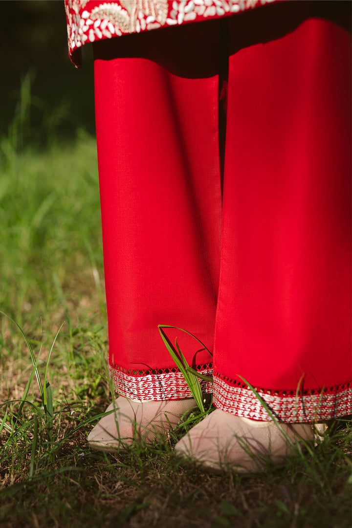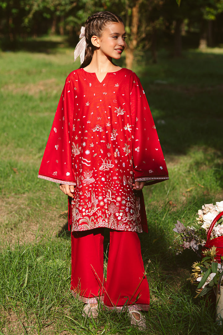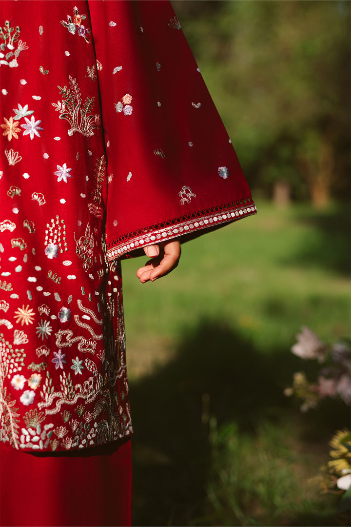 Candy red and full of life — Comet features conversational embroidery with a dispersing spray design that feels vibrant and bold.