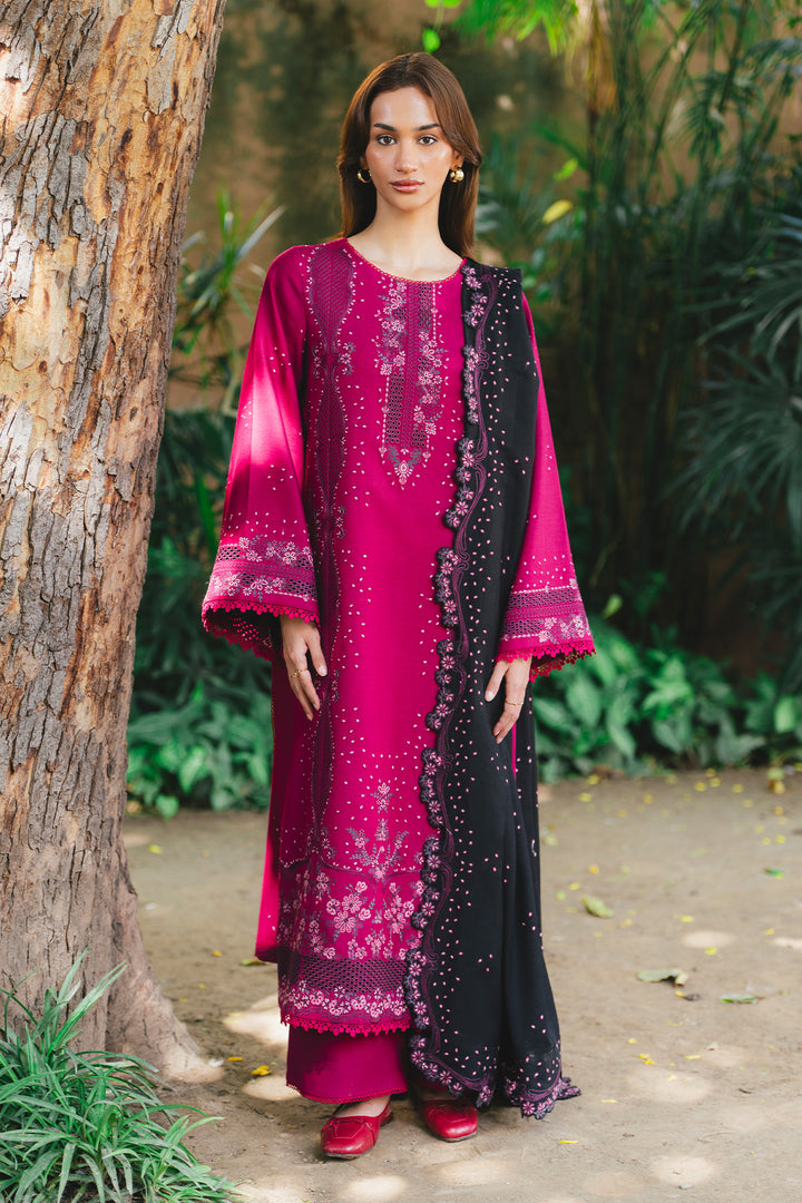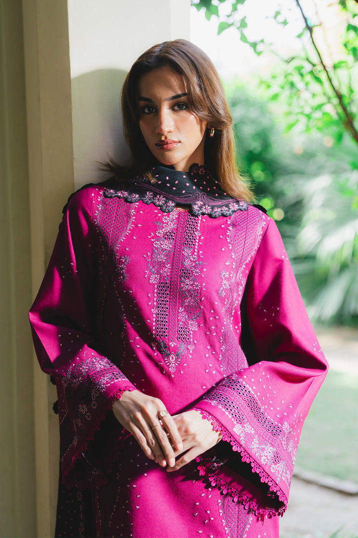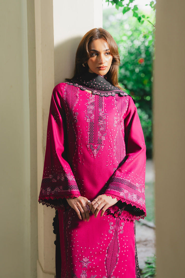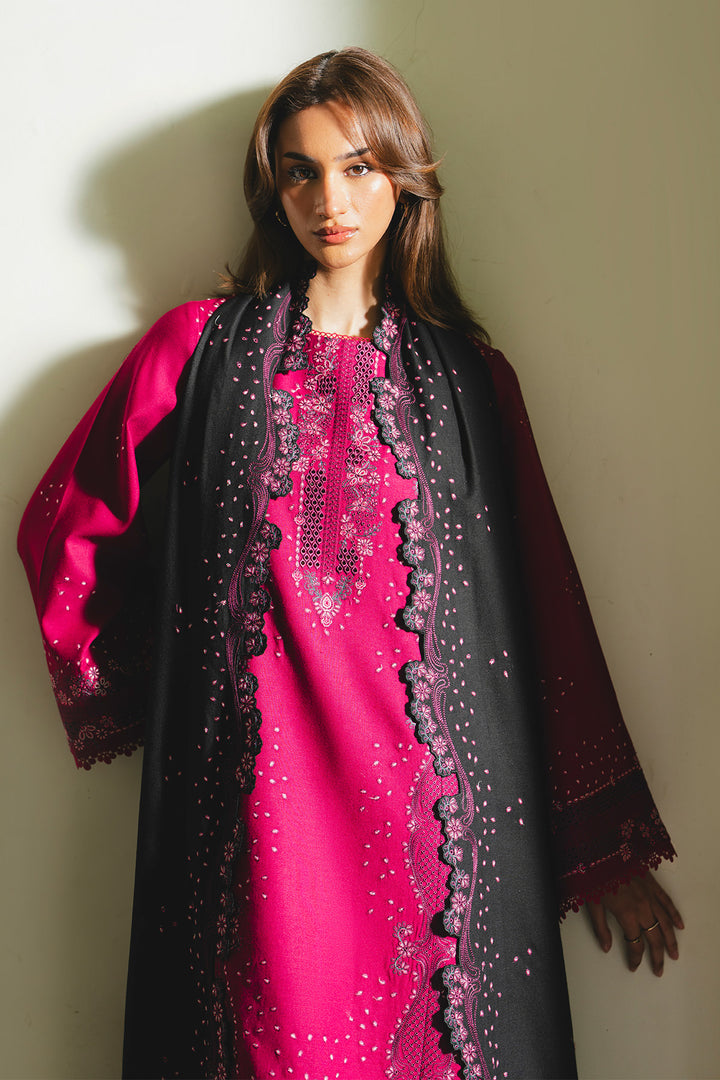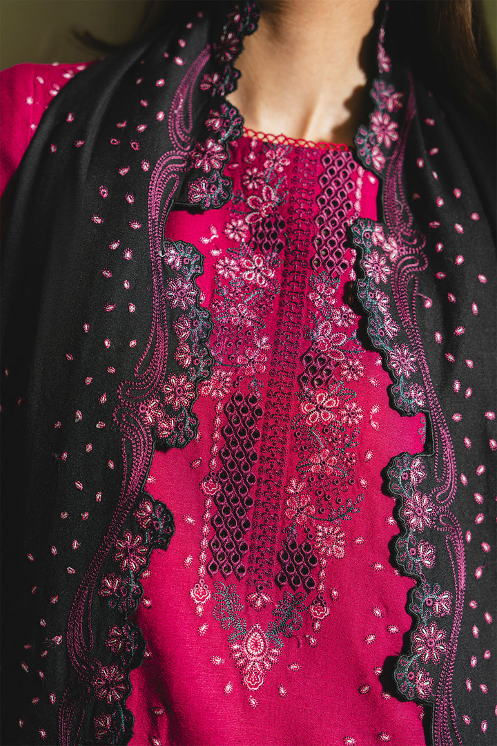 A classic karandi shirt featuring intricate dori-effect embroidery in a timeless schiffli pattern. Completed with an embroidered karandi shawl and trouser for an elegant winter statement.