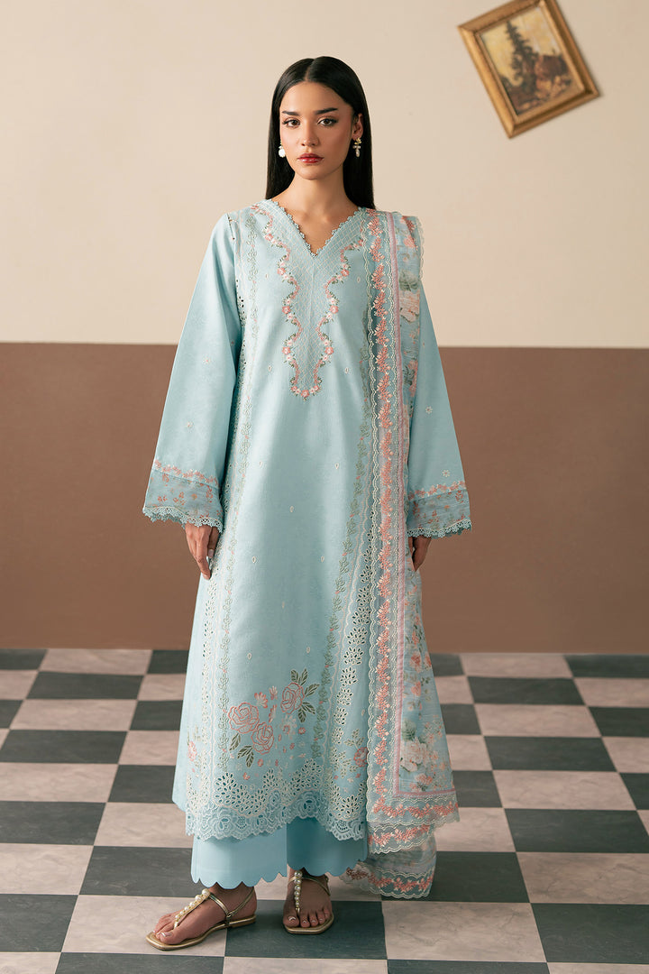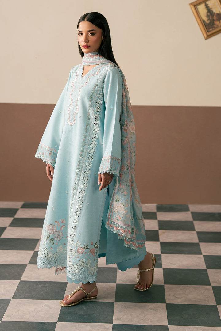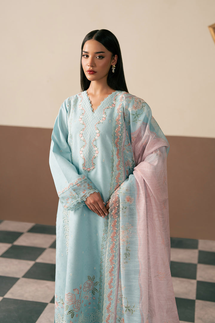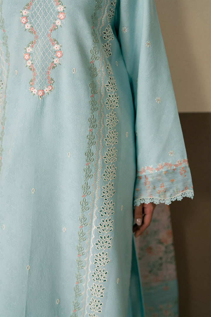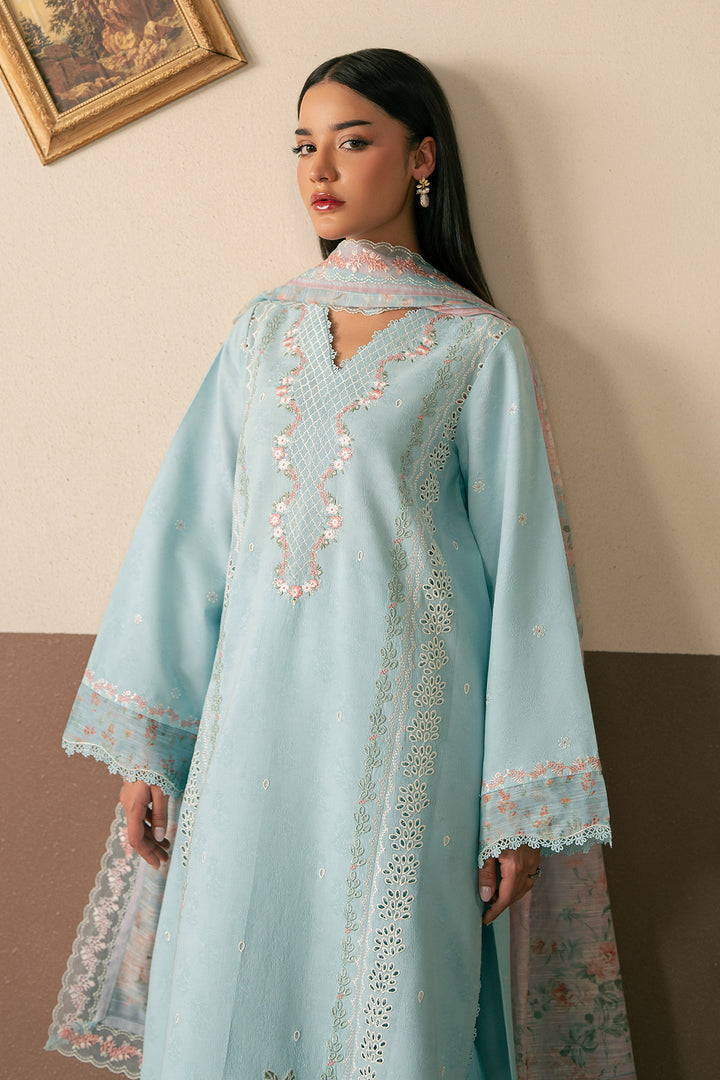 A Jacquard shirt that falls just right. Printed borders frame the sleeves. The dupatta adds rhythm, the cambric trouser keeps it grounded.