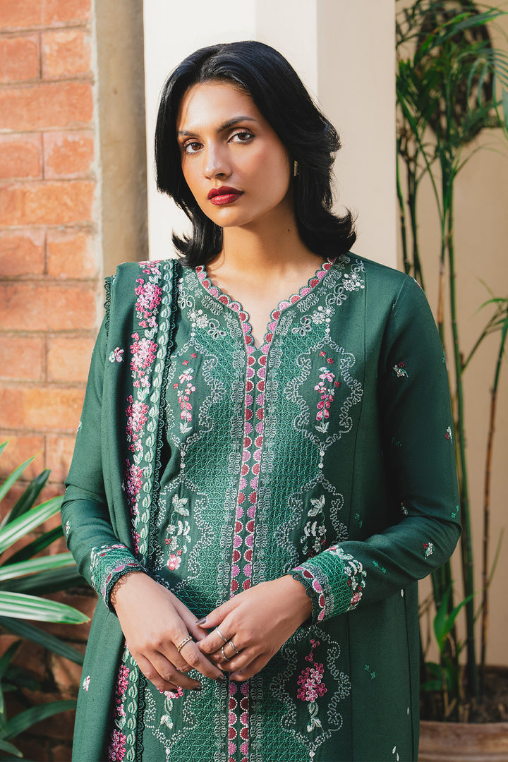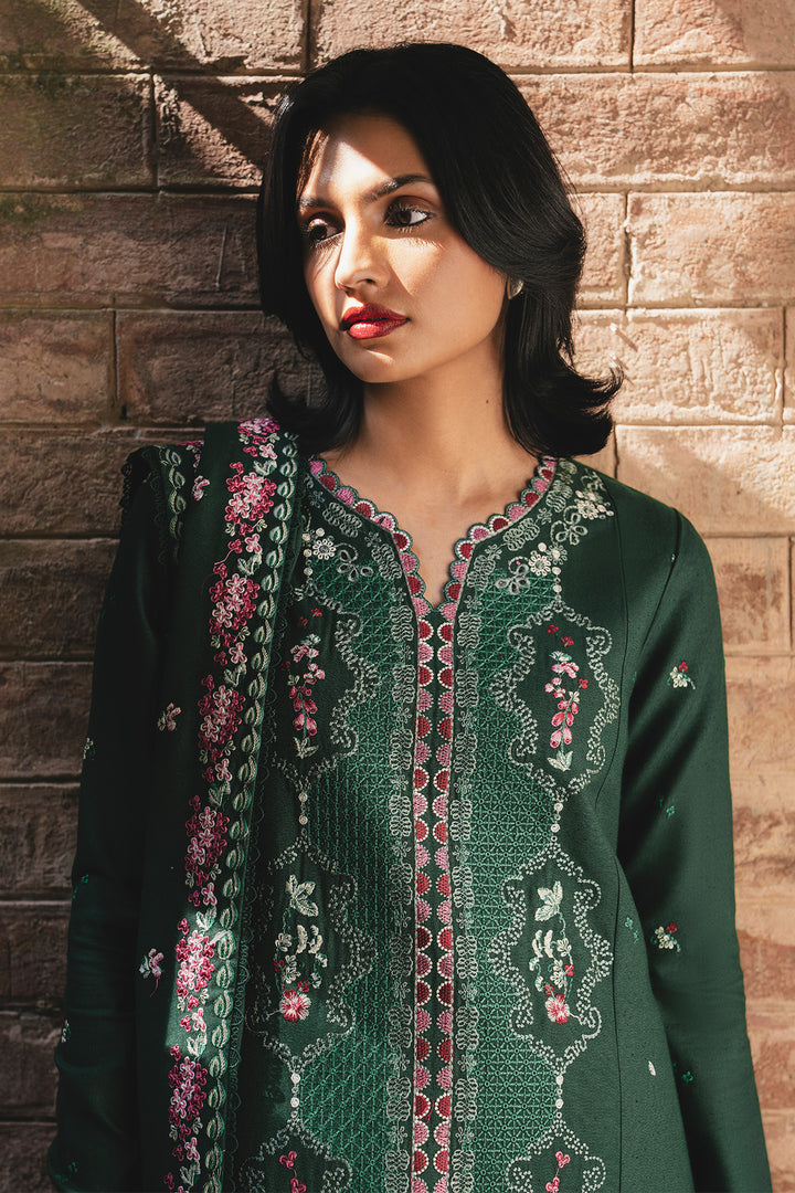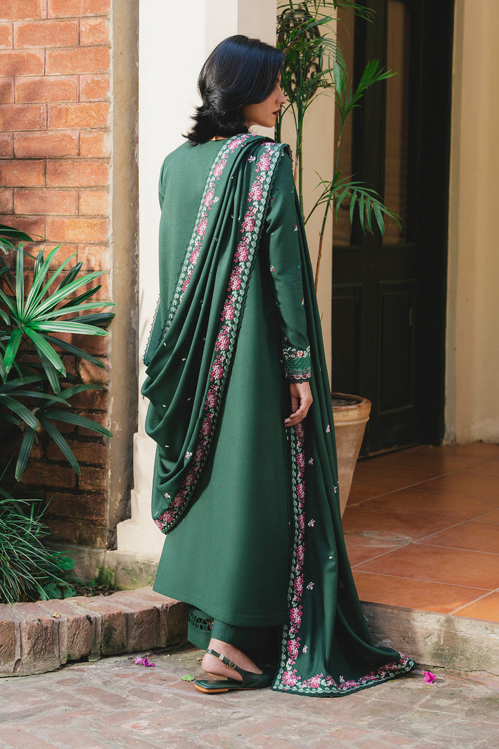 A deep green karandi ensemble with schiffli effect embroidery in a dori finish. Paired with an embroidered karandi shawl and matching trouser for a classic winter look.