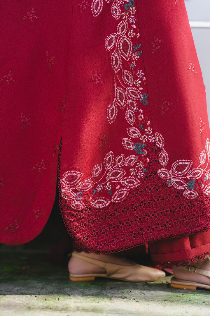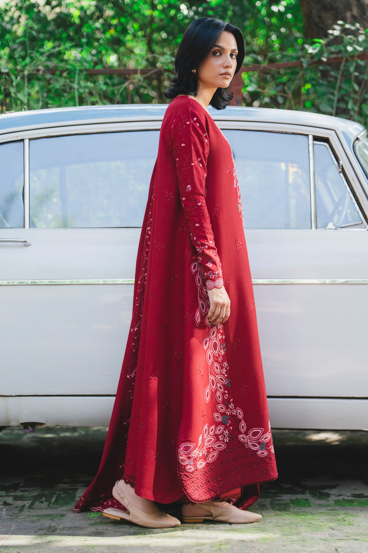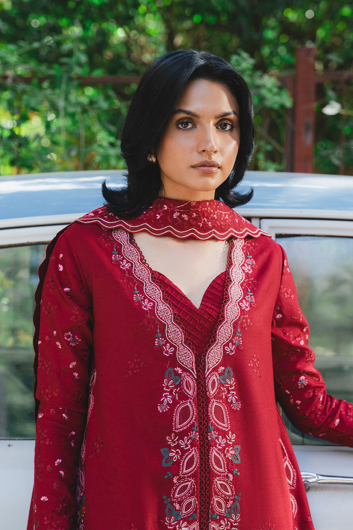 A charming karandi paneled shirt showcasing a schiffli effect with subtle floral motifs and pintex on the neckline. Styled with an embroidered shawl and karandi trouser for a refined, feminine appeal.