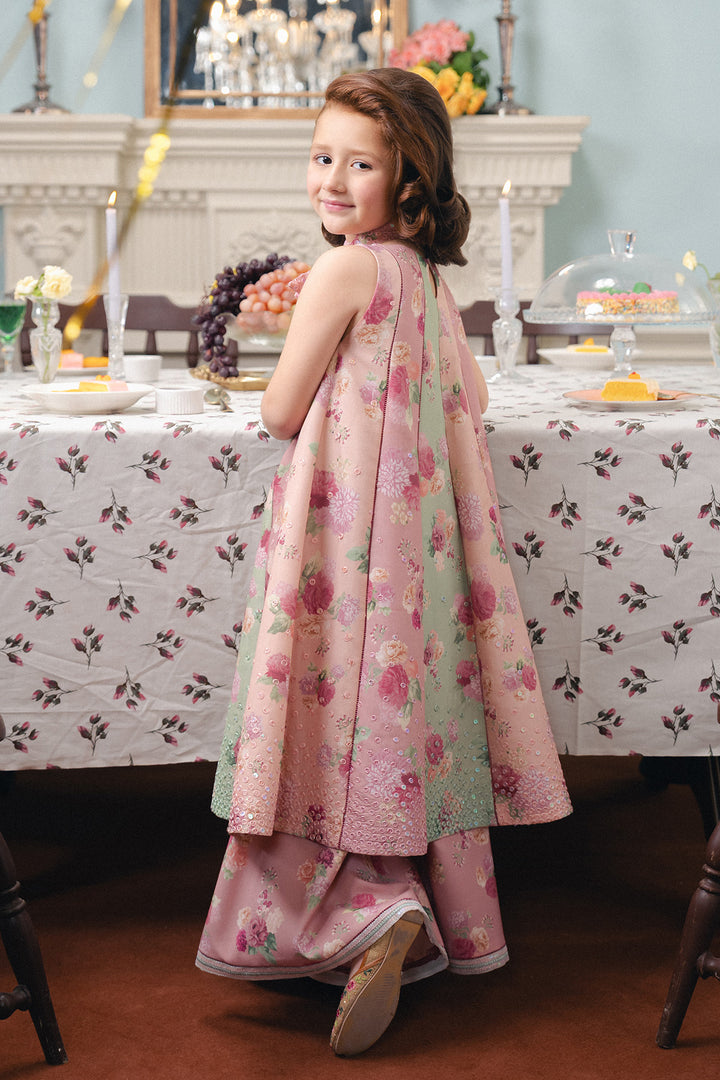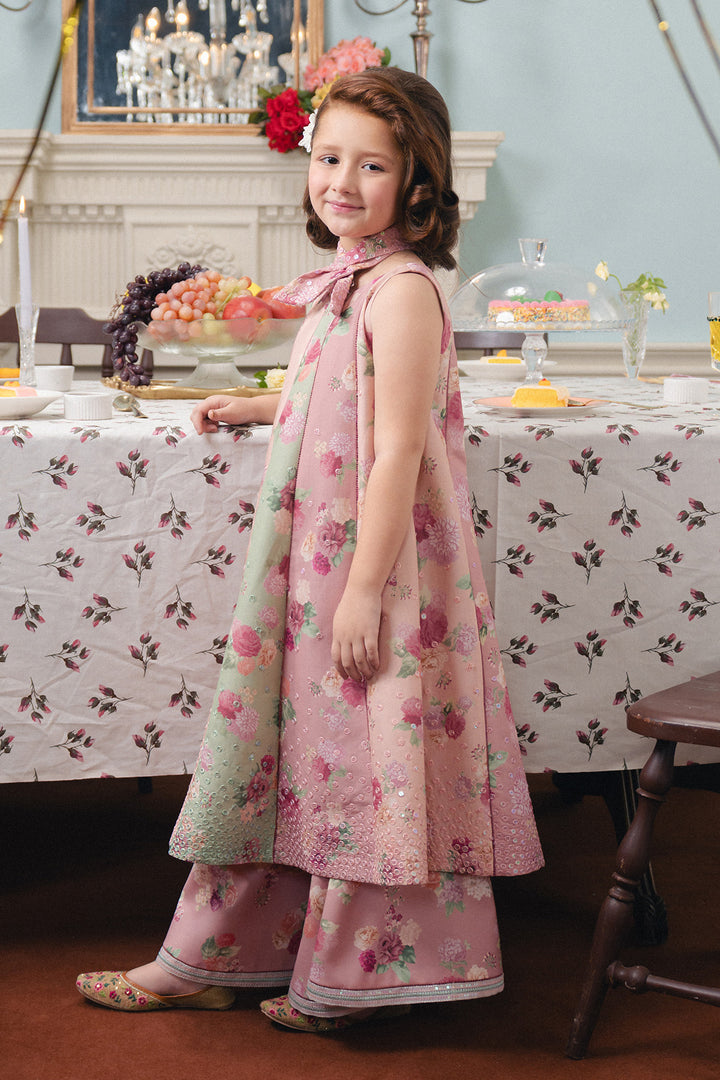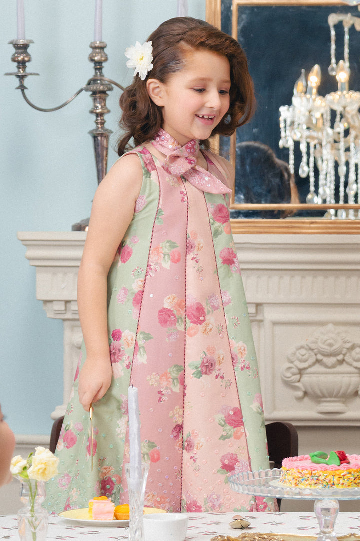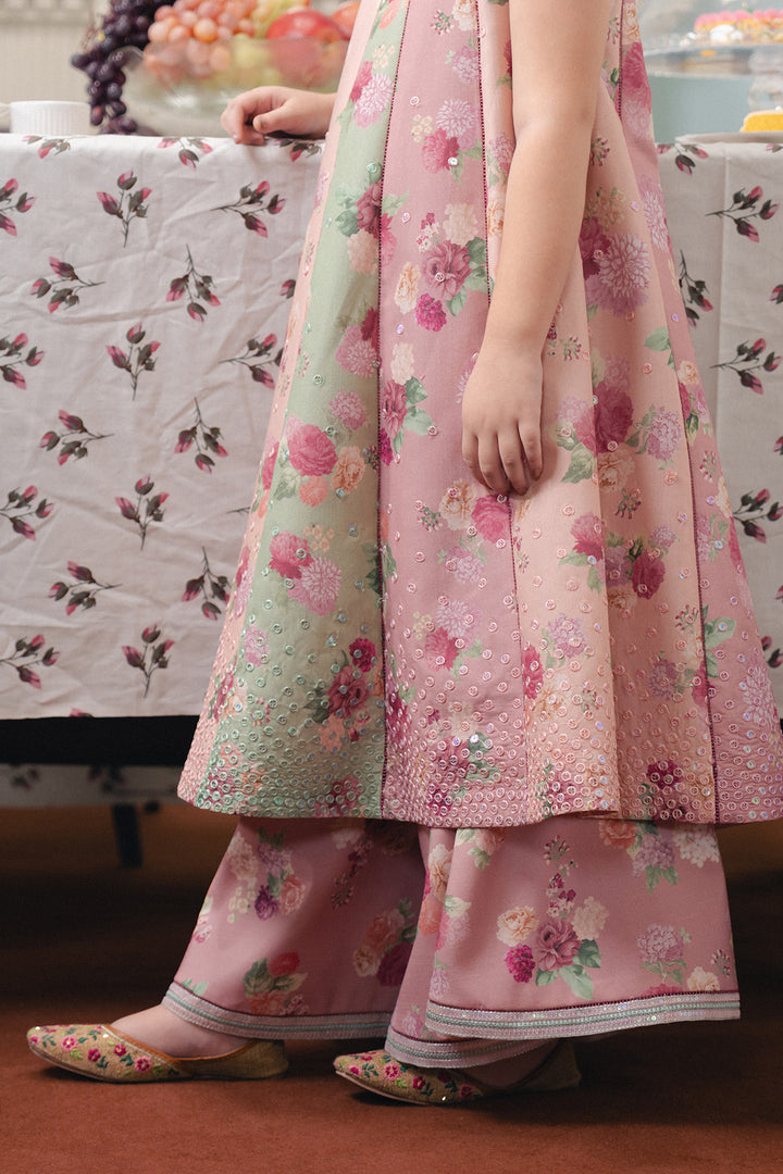 Two-piece set featuring a printed and sequined embroidered multi-colored paneled frock paired with exaggerated culottes.