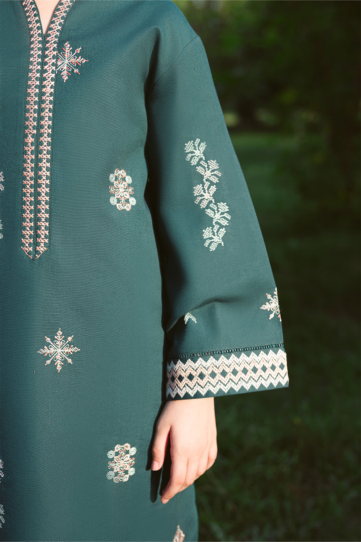 A deep pine green shirt with elongated neckline embroidery and cross-stitch sleeves. Skylar brings quiet sophistication and timeless detail together beautifully.