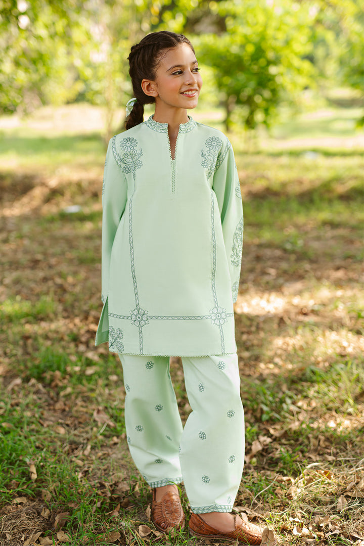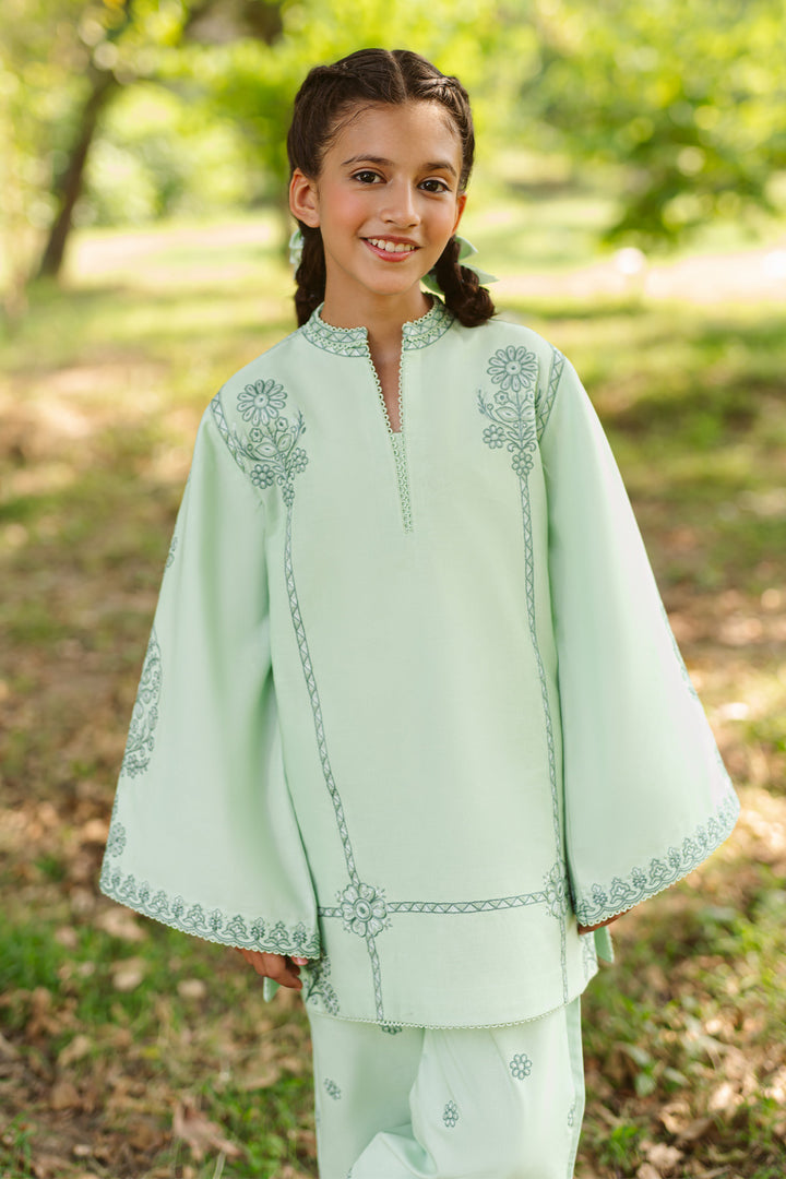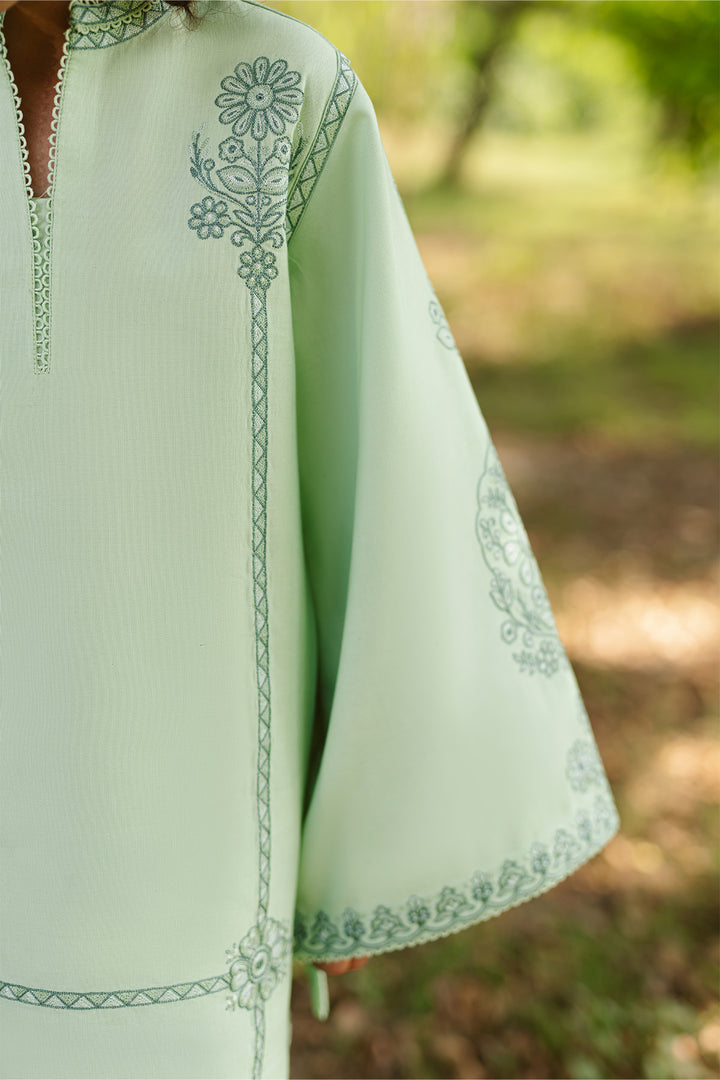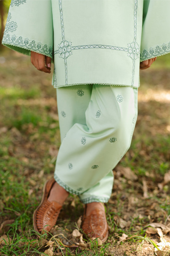 A soothing seafoam green base uplifted with darker embroidery — Starling blends softness with statement. Finished with a chic fusion shalwar for a modern festive feel.