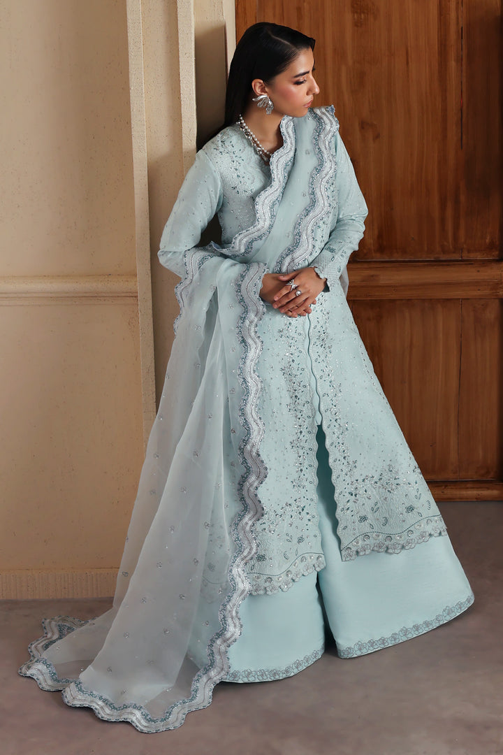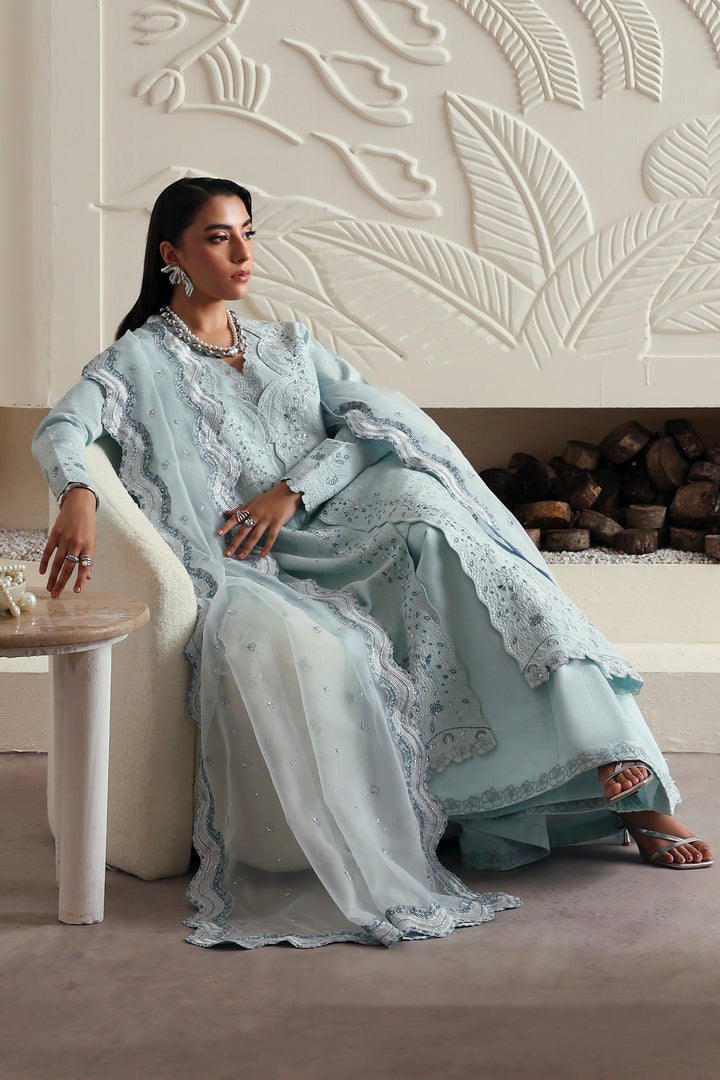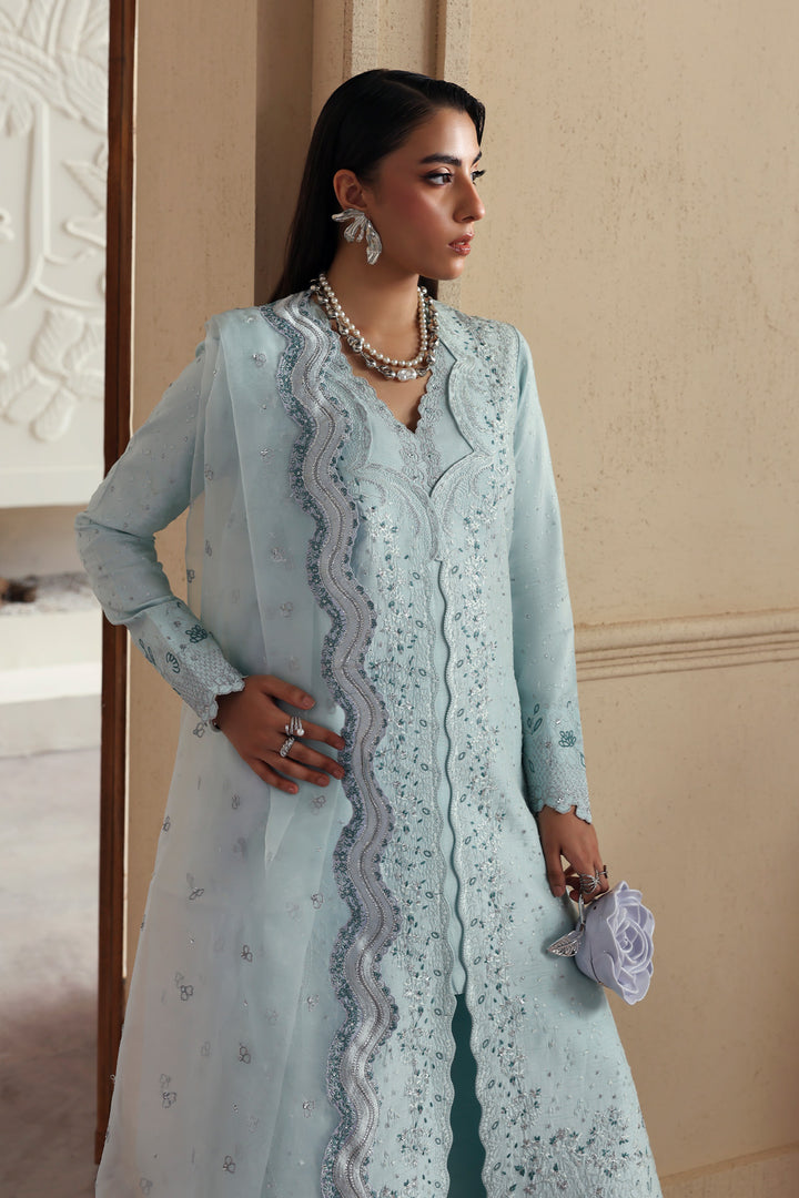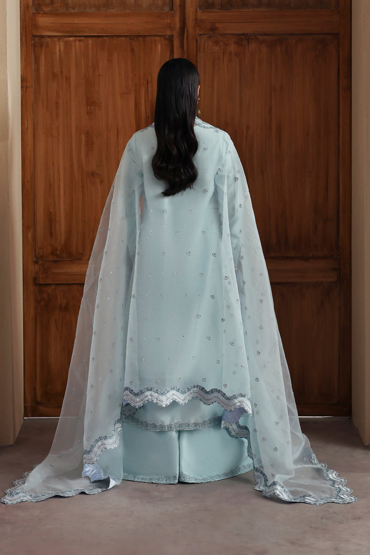 Soft yet certain. The Ramen silk shirt carries subtle self-embroidery, flowing into an organza dupatta that moves with ease. Ramen silk trousers, touched with embroidery, finish the look in quiet grace.