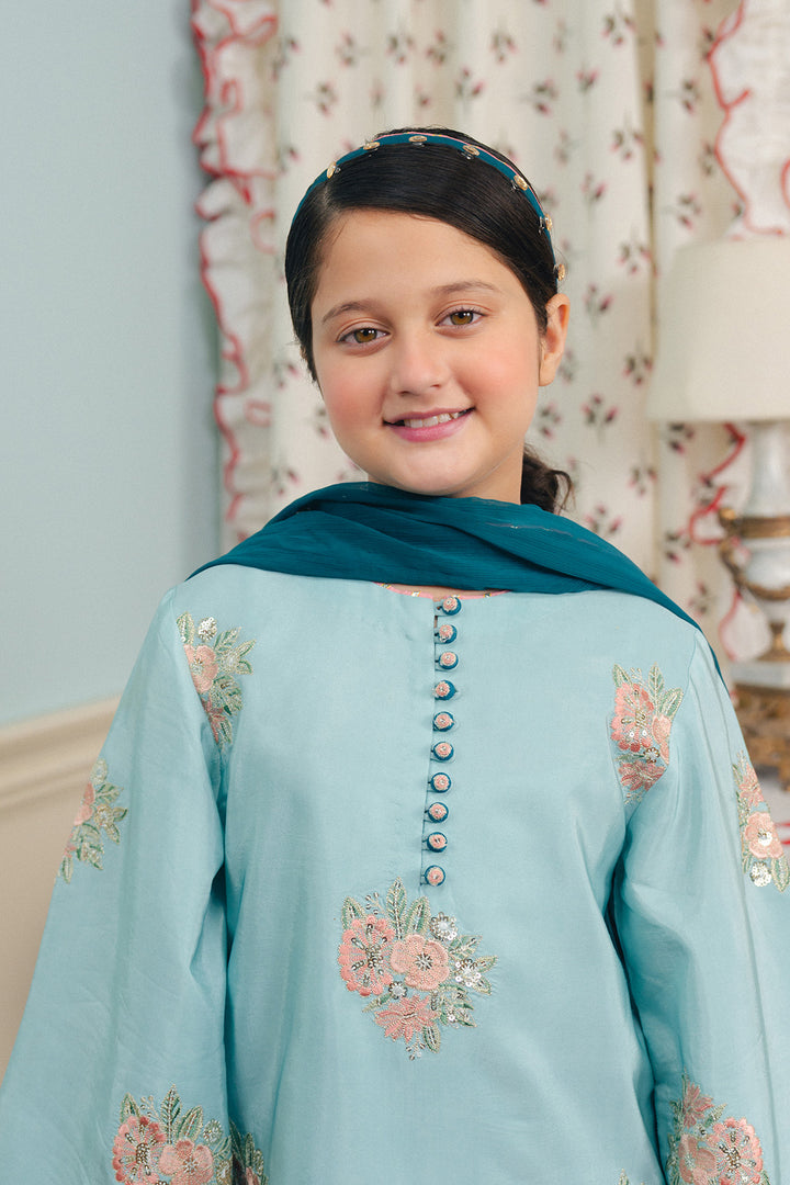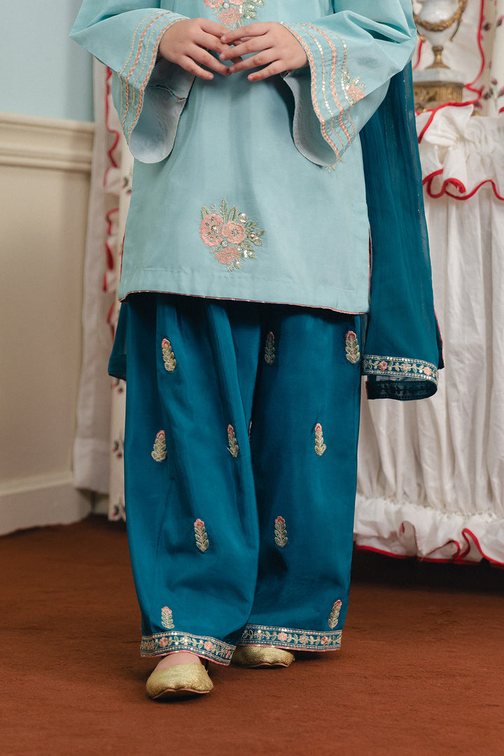 Three-piece set featuring floral bunch embroidery on the shirt, paired with a contrasting embroidered shalwar and a matching contrasting chiffon dupatta.