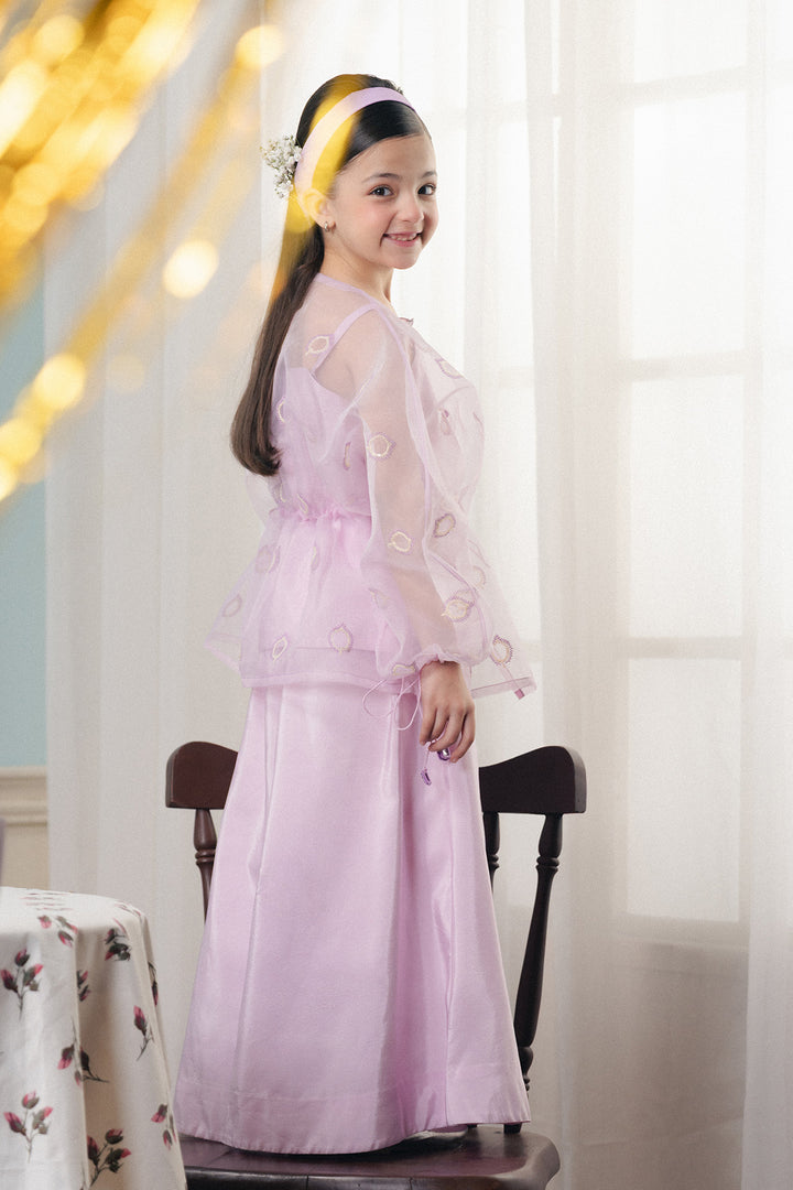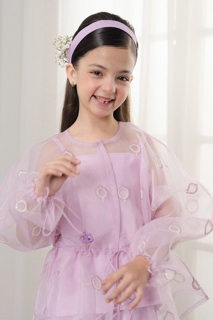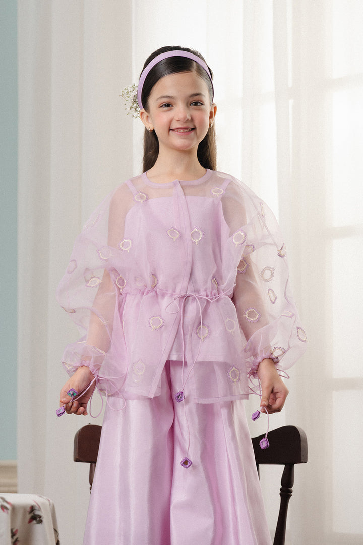 Three-piece set featuring a silk inner and culottes, paired with a sheer layered top adorned with sequined embroidery and shisha work tassel detailing.