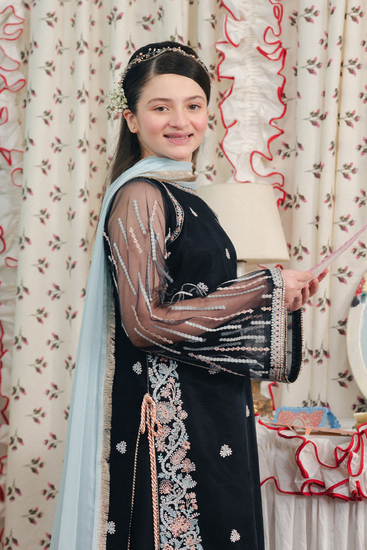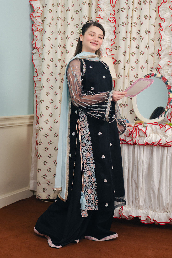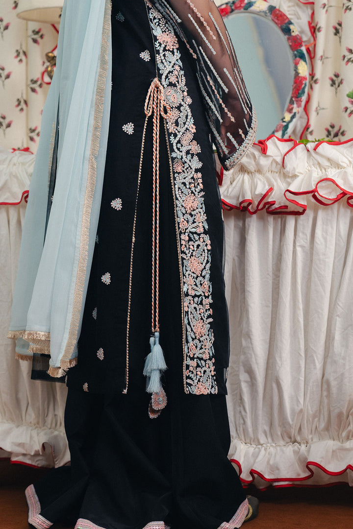 Three-piece set featuring a net embroidered shirt with detailed sleeves, paired with a silk sharara and a finished chiffon dupatta.